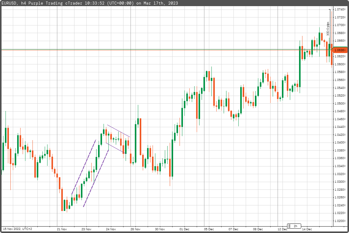 - Identifikujte formaci – hledejte dvě sbíhající trendové linie. Jednu, která spojuje všechny highs a druhou, která spojuje všechny lows. Tyto čáry by se měly svažovat ve stejném směru (nahoru či dolů).