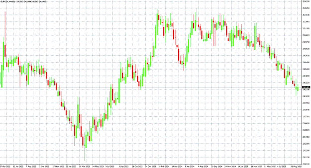 Měnový pár EUR/CZK na W1 grafu, zdroj: MT4