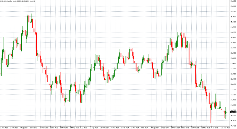 Měnový pár USD/CZK na W1 grafu, zdroj: MT4