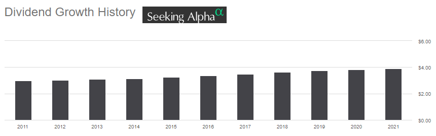 Společnost navyšuje výplatu dividend 11 let v řadě. Současný dividendový výnos činí 4,03 % s výplatní poměrem 74,38 %.