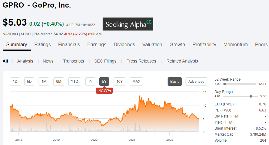 Akcie společnosti GoPro vstoupily na burzu v roce 2014 a rychle dosáhly na historické maximum ceny 93,85 dolaru, ale v polovině října 2022 se obchodují za pouhých 5 dolarů, což je o neuvěřitelných 95 % méně. Investoři se společnosti běžně vyhýbali kvůli jejímu jednorozměrnému obchodnímu modelu, se kterým bylo náročné udržet růst, ale to se brzy změní.