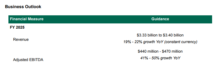Pro rok 2025 očekává tržby v rozmezí 3,33 až 3,4 miliardy dolarů, což představuje meziroční růst o 19 % až 22 % na konstantní měnové bázi. Adjusted EBITDA se odhaduje na 440 až 470 milionů dolarů, což znamená růst o 41 % až 50 % meziročně.