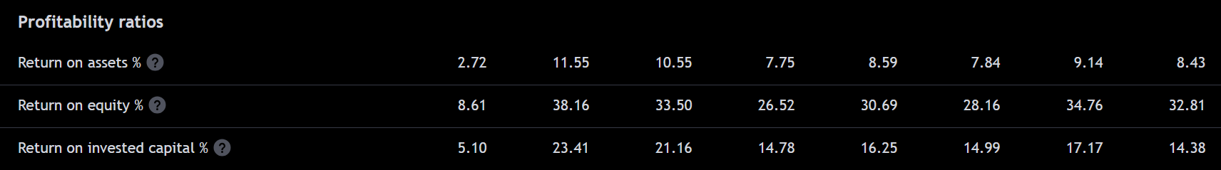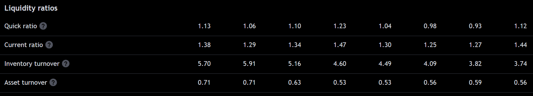 - Vývoj: Hodnoty se pohybovaly od 5,30 (2018) do 8,63 (2023), přičemž TTM hodnota je 8,48.