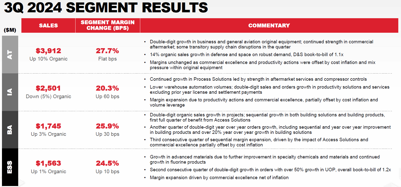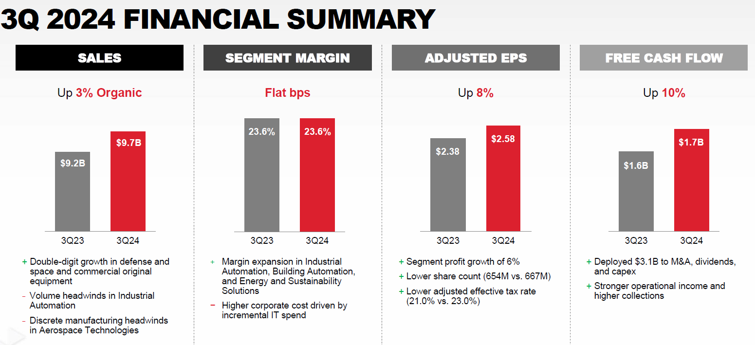 Společnost Honeywell očekává ve 4. kvartálu roku 2024 tržby v rozmezí 10,2 až 10,4 miliardy USD, což představuje meziroční nárůst 2,0 – 4,0 % oproti předchozímu roku. Segmentová marže by se měla pohybovat mezi 23,8 % a 24,2 %, což naznačuje stabilní provozní efektivitu (meziročně pokles o 20 až 60 bps). Upravený zisk na akcii (adjusted EPS) se očekává na úrovni 2,73 – 2,83 USD (1,0 – 5,0% meziroční růst).