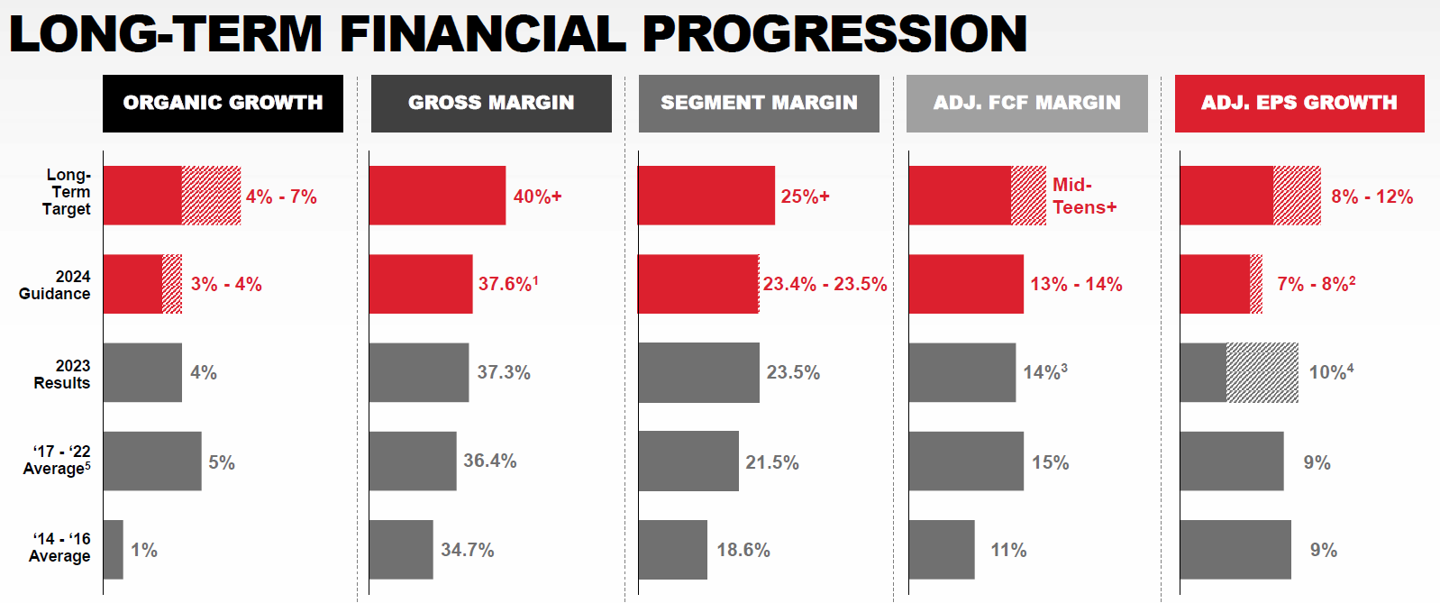 Společnost Honeywell nám poskytuje zajímavý pohled na to, jak očekává (nebo doufá), že se budou vyvíjet její finanční ukazatele v dlouhodobém horizontu (obrázek níže).