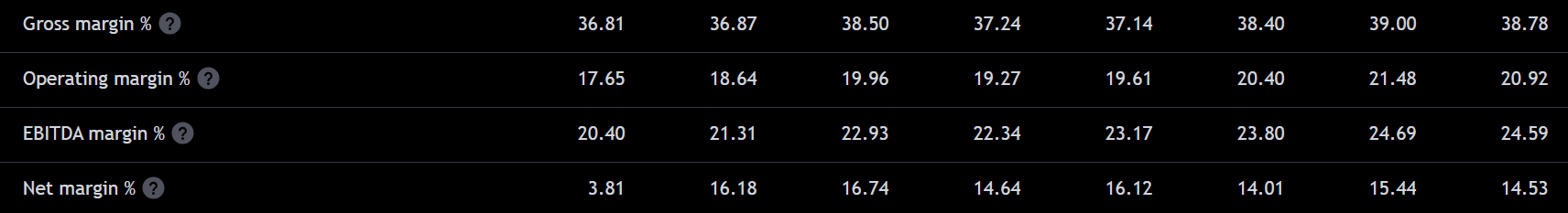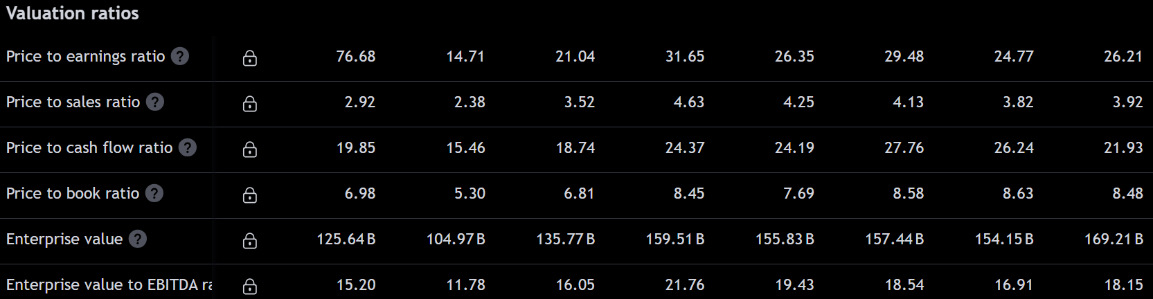 - Vývoj: Historické hodnoty se pohybovaly mezi 14,71 (2018) a 31,65 (2020), přičemž současná hodnota TTM činí 26,21.