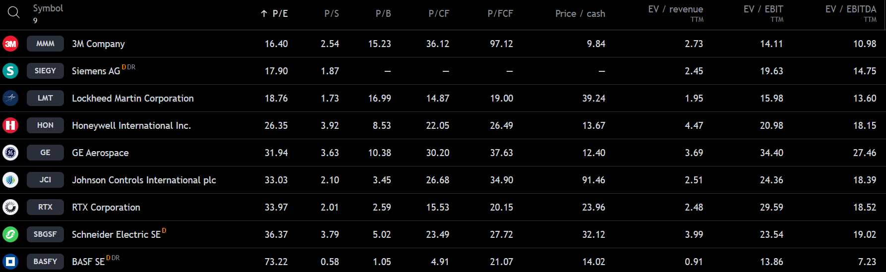 Honeywell má ve většině ukazatelů průměrné až nadprůměrné ocenění, a to jak ve srovnání s jeho historickými hodnotami, tak v porovnání s klíčovými konkurenty. Relativně vysoké ocenění vykazuje zejména u ukazatele P/S, který naznačuje, že akcie společnosti jsou oceněny výrazně výše v poměru k tržbám než u konkurence. Podobně u ukazatele EV/EBITDA, kde se projevuje vyšší zadlužení společnosti, což ji v tomto ohledu staví do méně příznivé pozice oproti konkurenci.