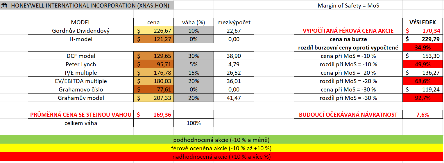 Pojďme se nyní zaměřit na aktuální ocenění společnosti Honeywell. Veškerá data jsou platná k 4. prosinci 2024, kdy se cena akcie HON pohybovala na úrovni 229,79 USD. Všechny valuační ukazatele a metody budou vypočteny s ohledem na tuto cenu.