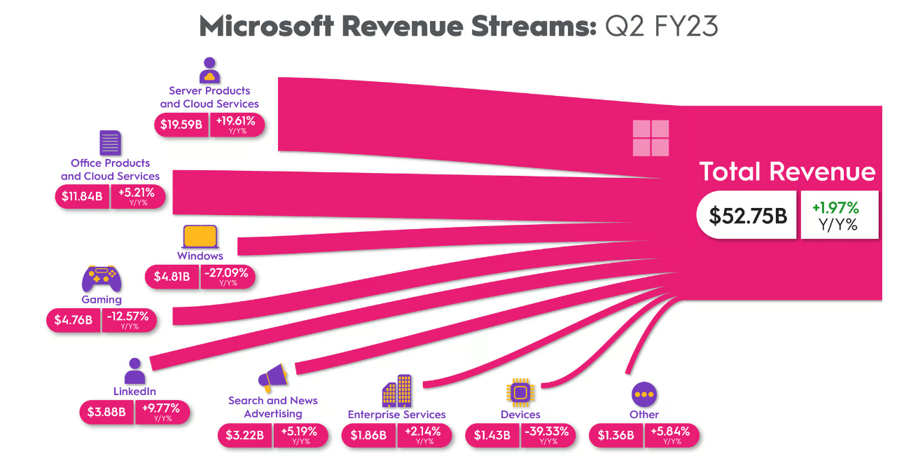I kdyby se Microsoftu díky modernizaci Bingu podařilo dominantnímu hráči vyrvat část trhu s vyhledáváním, pohne to s finančními výsledky Microsoftu tak, aby to mohlo podpořit úvahy o investici do tohoto technologického gigantu? Vyhledávání je malou částí podnikání společnosti Microsoft. Pokud se podíváte na toky příjmů společnosti za druhé fiskální čtvrtletí roku 2023 (které skončilo 31. prosince 2022), vyhledávání a reklama se na nich moc nepodílely – jen 3,22 miliardy dolarů z celkových 52,75 miliardy dolarů.