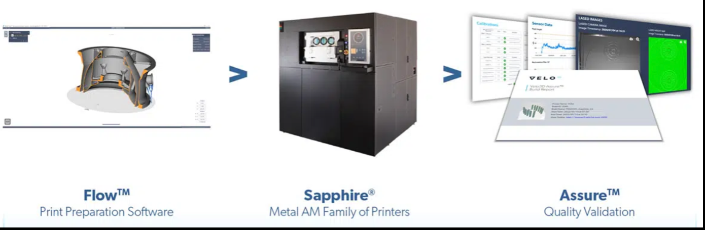 Inteligentní řešení aditivní výroby kovů Velo3D se skládá ze softwaru pro přípravu tisku Velo3D Flow, rodiny 3D tiskáren Sapphire, softwaru pro ověřování a kontrolu kvality v reálném čase Assure.