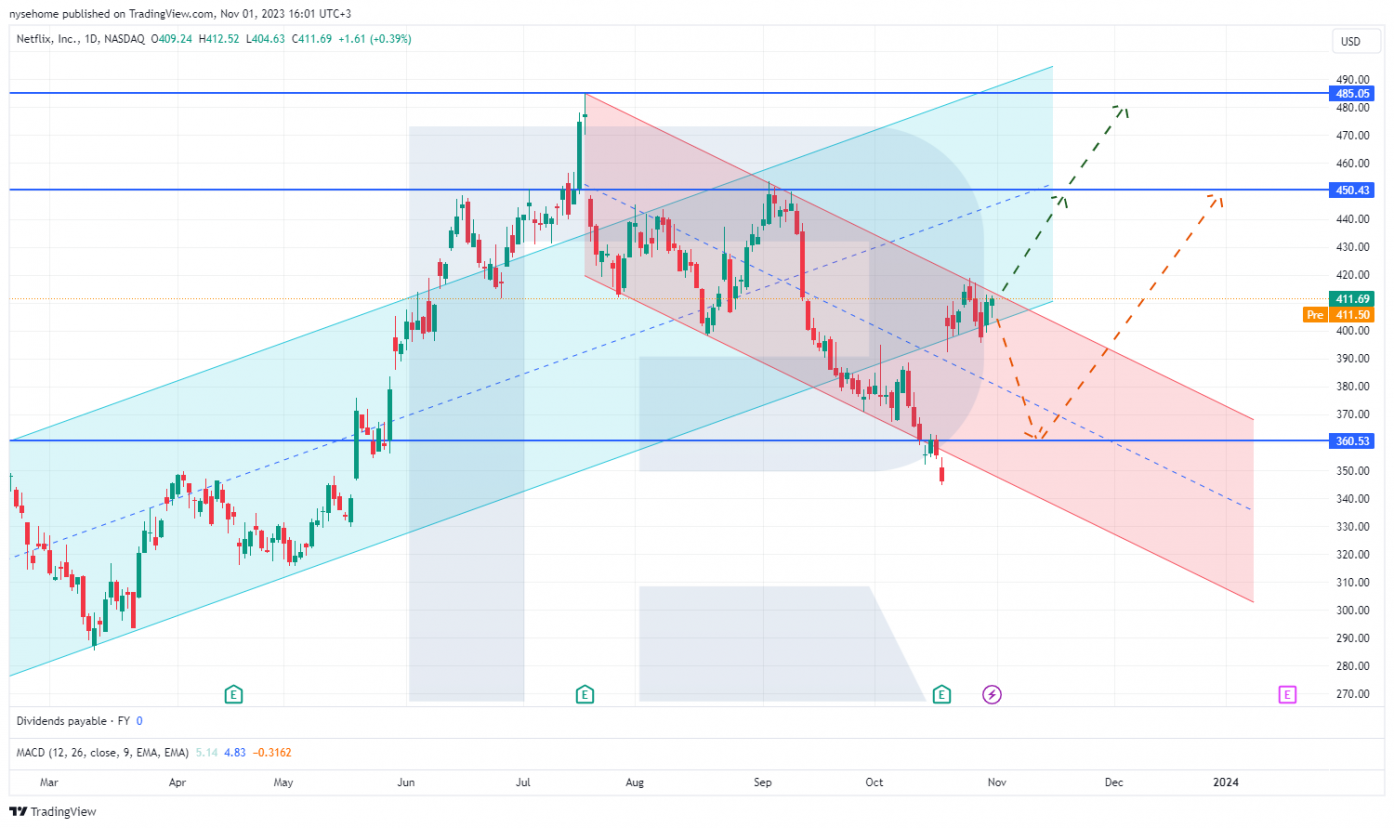 V první polovině října 2023, jen pár dní před vydáním zprávy za 3. čtvrtletí, akcie Netflix Inc. prorazily růstovou trendovou linii a opustily růstový kanál. Tento vývoj je pravděpodobně indikátorem konce uptrendu.
