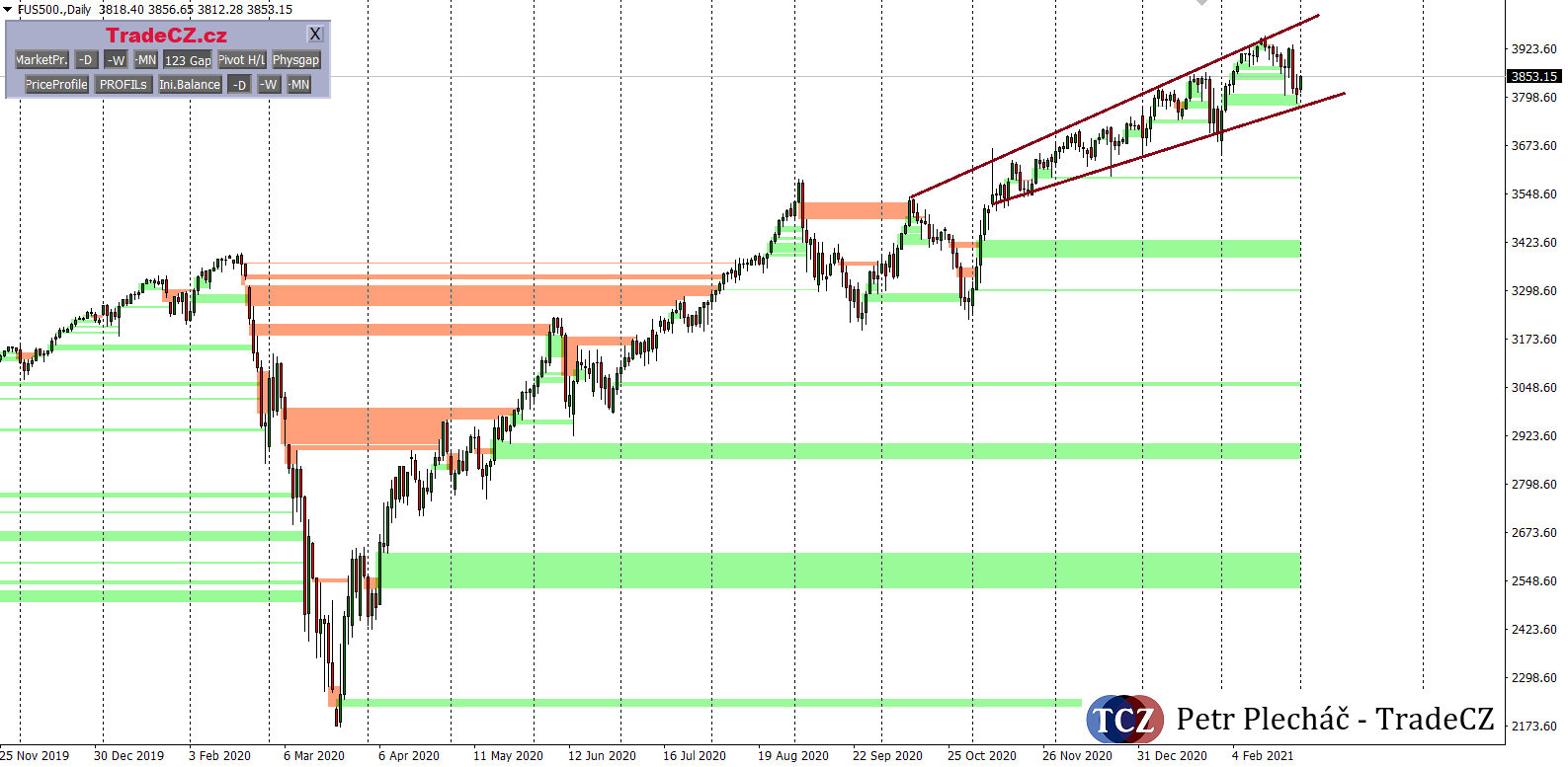 Akciový index SP500 předvedl v posledním týdnu velmi zajímavou korekci, kterou jistě využilo mnoho obchodníků a investorů k nákupu levnějších aktiv. Faktem i nadále zůstává, že na trzích je ohromné množství likvidity a veškeré DIPy budou velkými hráči vykupovány. Trh se drží v rámci rostoucího trendového kanálu, resp. trychtýře, a pokouší se o růst k horní trendové linii. Pondělní open je doprovázeno zvýšenou volatilitou. Před sebou máme ADP a NFP report, údaje PMI a ISM a data z trhu práce. Čína svou aktivitou průmyslu překvapila spíše negativně, ale pokrok ve stimulačním balíčku USA tento fakt zastínil. Bude nanejvýš důležité sledovat vývoj na dluhopisovém trhu a open na Wall Street.