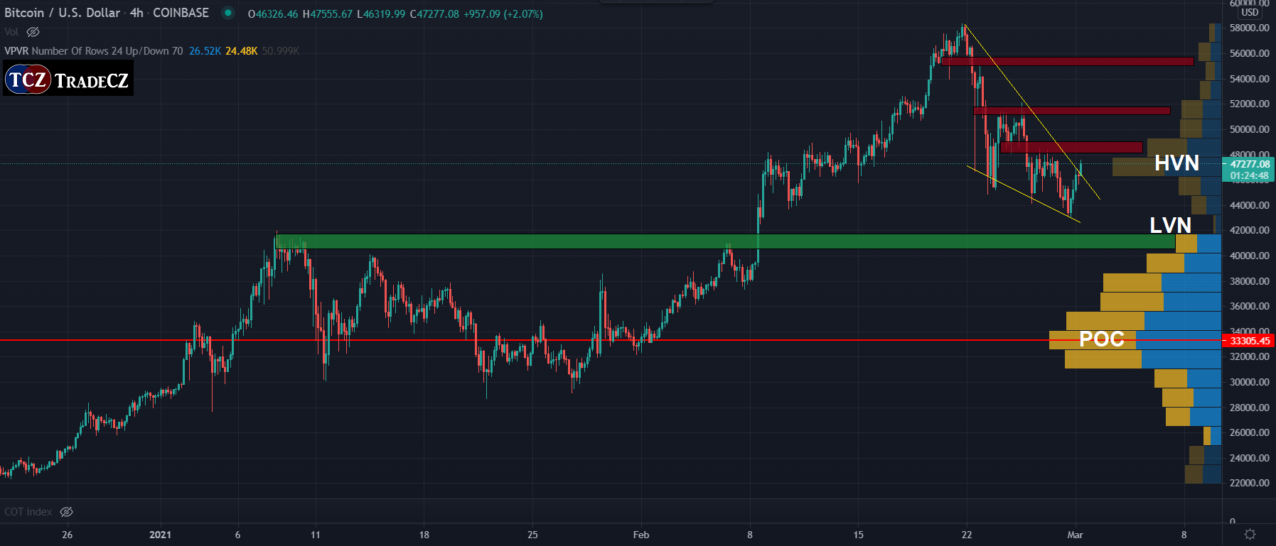 Bitcoin aktuálně zareagoval na silnou supportní úroveň 44 000 USD, která v minulosti zafungovala jako podpora hned několikrát. Každý dotyk této úrovně však podporu oslabuje, a v případě breaku bychom mohli být svědky poměrně rychlého poklesu ceny až k 40 000 USD. V této oblasti se nachází Low Volume Node z Volume Profile a překonané předchozí swing high se začátkem iniciačního pohybu. Z technického hlediska se Bitcoin snaží prorazit klesající klín a započíst nový růstový cyklus. V této fázi se vyplatí sledovat, zda se trhu daří prorážet resistence a vytvářet z nich supporty.