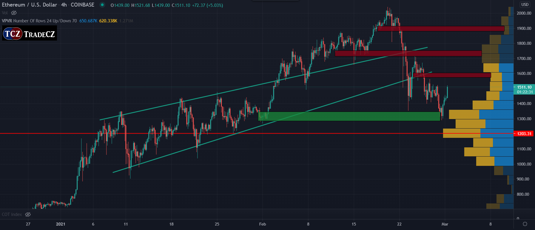 Také altcoin Ethereum prochází korekcí a dokazuje, že pro svůj růst potřebuje především dobrou náladu na Bitcoinu. Trh oslabil ze svého ATH o 36 % a prorazil psychologickou oblast kolem 1 500 USD. Trh se zastavil na horní oblasti hodnoty z Volume Profile, a z pohledu Price Action na začátku jedné z rostoucích fází trhu. Těsně pod touto úrovní se nachází POC, před kterým trh nabral likviditu a pokouší se o další růstovou fázi. Na grafu jsme svědky průrazů resistencí, což je jasně býčí signál, na druhou stranu se trh může pouze dostávat do konsolidace a tradeři by měli vždy umisťovat své ochranné stop lossy.