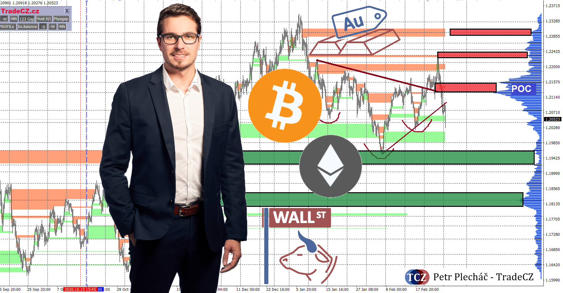 V dnešním burzovním výhledu se podíváme optikou technické analýzy na vybrané instrumenty (BTC, ETH, SP500, EURUSD, zlato) a rozebereme si jednotlivé hybatele trhů pro 9. týden 2021.