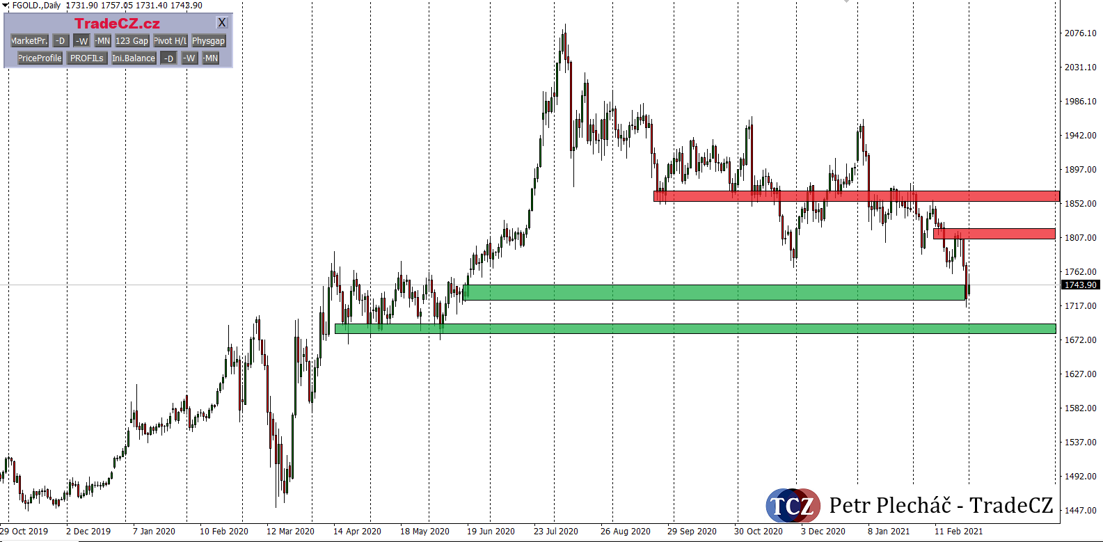 Zlato breaklo důležitou podporu 1 800 USD za unci a reaguje na oblast kolem 1 730, kde se nachází support v podobě 50 % z předchozí oblasti konsolidace. Cestou dolů má zlato několik důležitých supportů, přičemž nejvýznamnější je na 1 500 USD / unci.