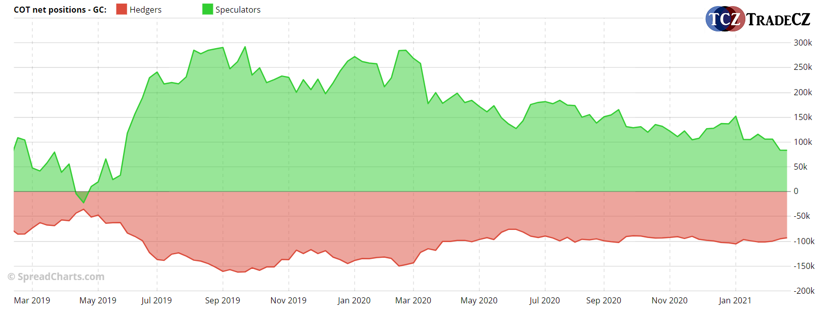 Zlato v návaznosti vývoje na dluhopisovém trhu a na dolaru oslabuje. Velcí spekulanti jsou stále net long, ale týden co týden své pozice snižují a zbavují se svých dlouhých pozic.