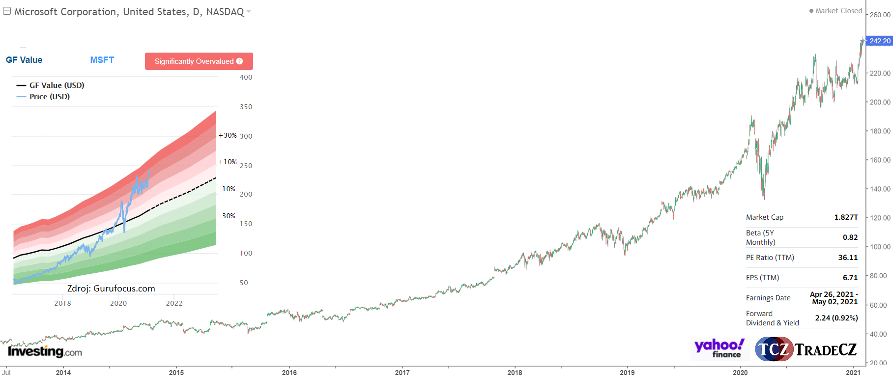 Dle Gurufocus jsou akcie Microsoftu významně nadhodnocené. Vnitřní hodnotu (férovou cenu) odhaduje kolem 170 USD. Hodnotový ukazatel P/E na 36 (36násobek výdělku vůči aktuální tržní ceně), P/S na 12 a P/B na 14 ukazují na poměrně drahou společnost, ale po aktuálním techno-boomu se není příliš čemu divit.