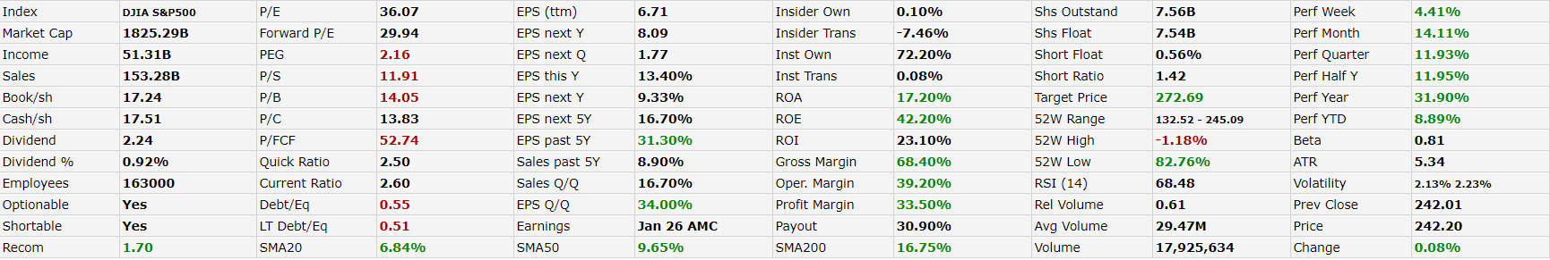 Akcie společnosti Microsoft najdeme zalistované v indexu DJIA (Dow Jones) i Nasdaq 100, v sektoru Technology a podsektoru Software—Infrastructure. Aktuálně se jedná o druhou nejhodnotnější americkou společnost (po Apple) s tržní kapitalizací přesahující 1,8 bilionů dolarů. Poslední příjmy Microsoftu se pohybují kolem 153 miliard dolarů za rok a zisk dosahuje přes 50 miliard za rok.