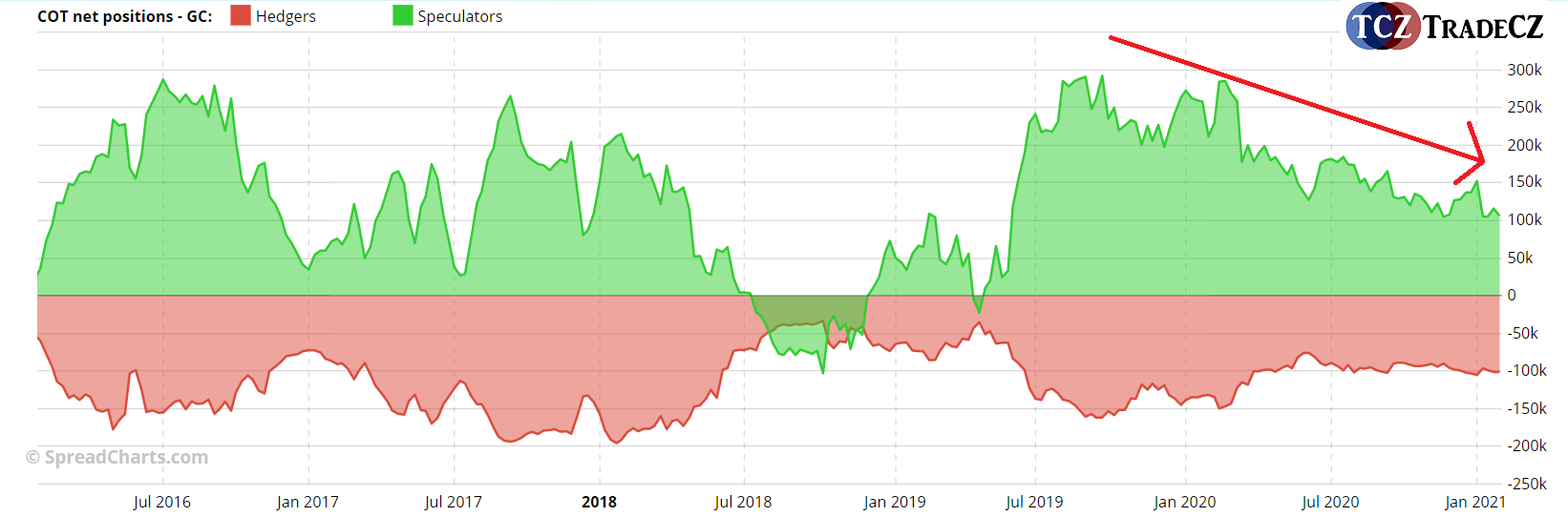 Velcí spekulanti i hedgers snižují své pozice na trhu již přes rok! Tento sestupný trend přesněji řečeno značí snižující se rozdíl mezi dlouhými a krátkými pozicemi. Aktuálně jsou velcí spekulanti cca 100 000 kontraktů net long a hedgers 100 000 kontraktů net short.