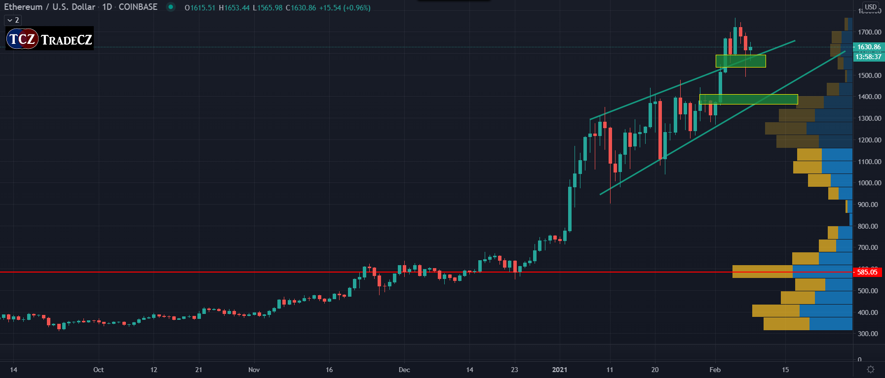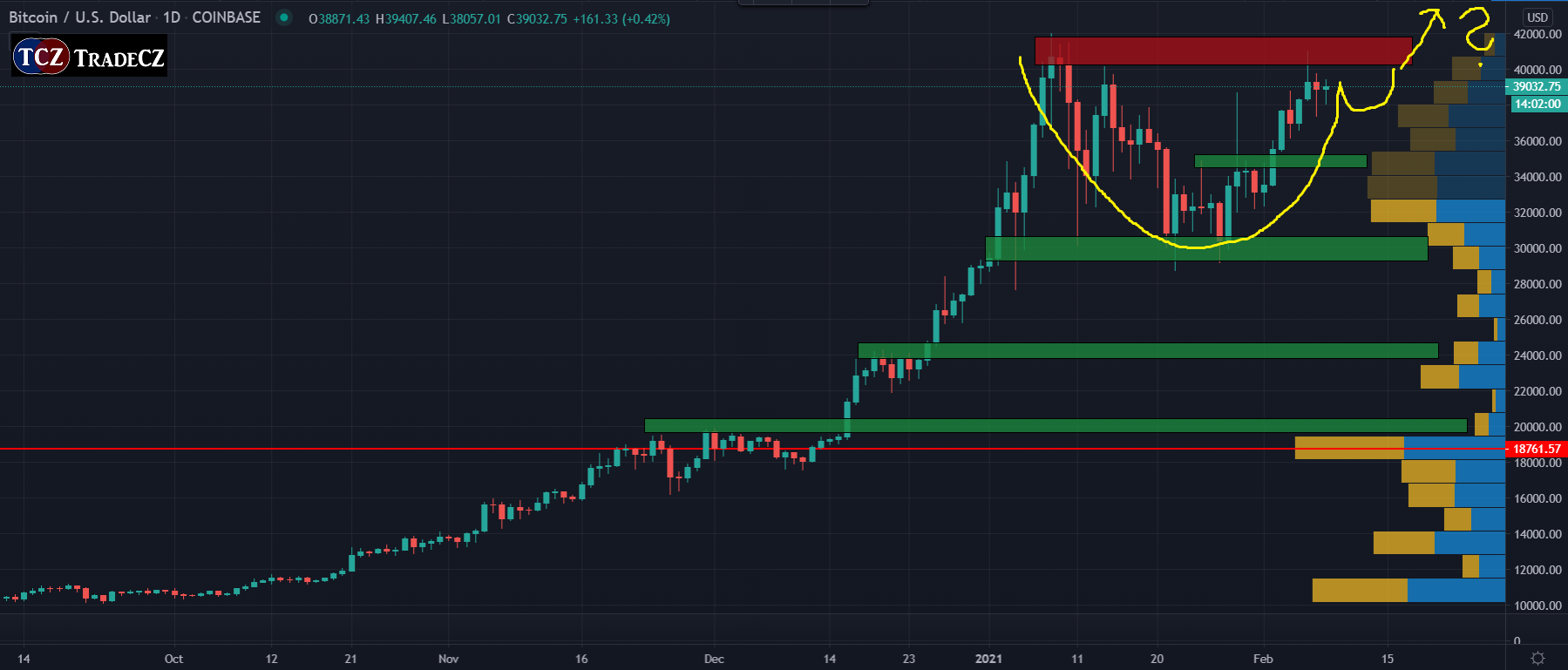 Obecně panuje na kryptoměnovém trhu dobrá nálada. Bitcoin se v posledních pár dnech snaží prorazit svá historická maxima, ale prozatím vidíme jasnou reakci na odpor 41 000 USD a podporu na 38 000 USD. Dalším silným supportem je dle Volume Profile POC poslední konsolidace 34 300 USD a poté psychologická cenová oblast a kulaté číslo 30 000 USD. Tento support byl v minulosti již mnohokrát testován a nachází se již mimo oblast hodnoty (pod value area low).