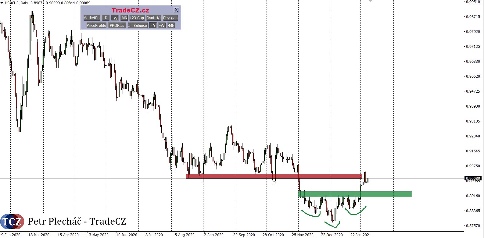 Měnový pár USDCHF kladně koreluje s indexem USD a negativně s měnovým párem EURUSD. Díky zpevňujícímu americkému dolaru v posledním obchodním týdnu se trh dostal z měsíční konsolidace ve tvaru Head and Shoulders, prorazil neckline a v pátek zareagoval na první možnou resistenci, a sice spodek předchozí oblasti hodnoty. V dalším týdnu bude důležité sledovat, zda se trh vrátí do sestupného trendu a tento break byl falešný, nebo zda jsme byli opravdu svědky dlouhodobějšího obratu trhu.