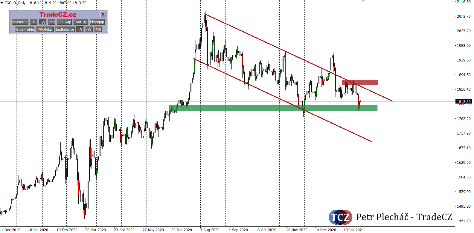 Zlato se dle technické analýzy dostalo na silnou supportní úroveň a vzhledem ke strachu ohledně zvyšující se inflaci, tlaku na dolar a nejistotě na trzích ohledně vývoje pandemie, lze očekávat, že by se z úrovně kolem 1 800 USD/unci mohla stát silná podpora.