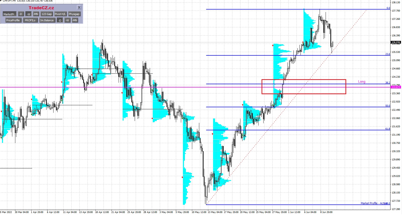 Long obchodní příležitost se na tomto měnovém páru nachází na ceně 133.673, kde vznikla konfluence silného Volume a 38,2 % Fibonacciho retracementu. Fibo v tomto případě dělá trochu neplechu, protože je předsunuté před Volume profile, ale případný long obchod s exekucí limitním příkazem není dobré posouvat, protože by se tak snížil poměr RRR. Pokud dojde k tržní reakci před zasažením čekajícího limitního příkazu, bude jej potřeba z trhu odstranit.