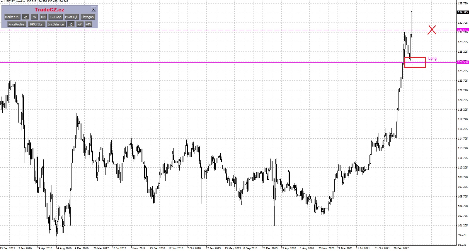 Na týdenním grafu se utvořila výrazná supportní zóna, která téměř volá po long obchodech. Tuto zónu bych nedoporučoval obchodovat. Vzhledem k tomu, že na historických maximech bude velké množství obchodníků ukončovat své long pozice, lze předpokládat silný korekční pohyb, při kterém tato zóna může být zcela ignorována.
