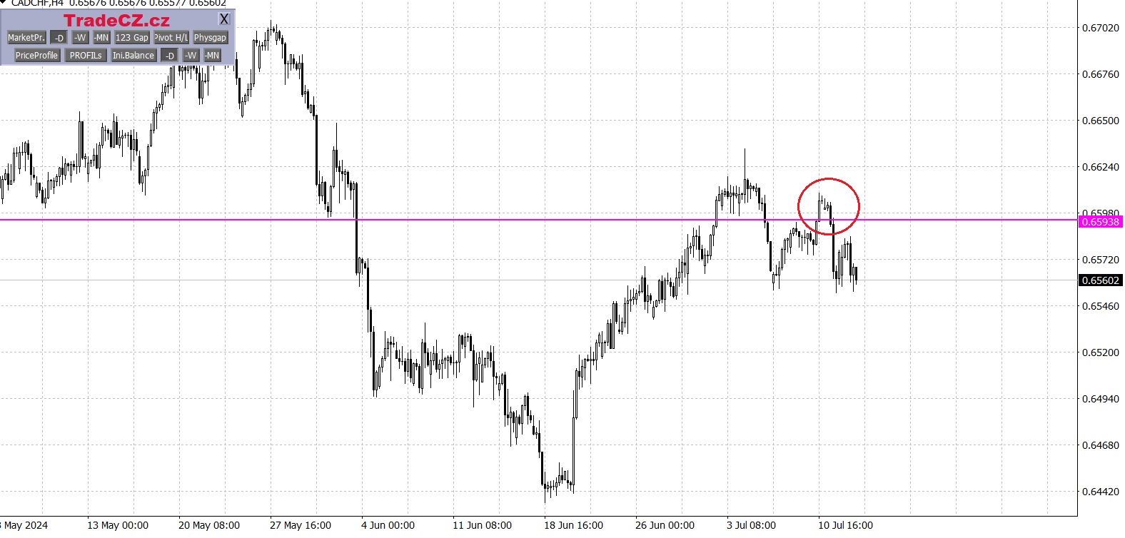 Nyní se ohlédneme za levelem, který jsme analyzovali v minulém FX výhledu. Jedná se o short level v cenovém výběžku, který trh při pullbacku otestoval. Nicméně v na tomto příkladu si ukážeme diverzitu tradingu, kdy tento level mohl být obchodován, ale také nemusel.
