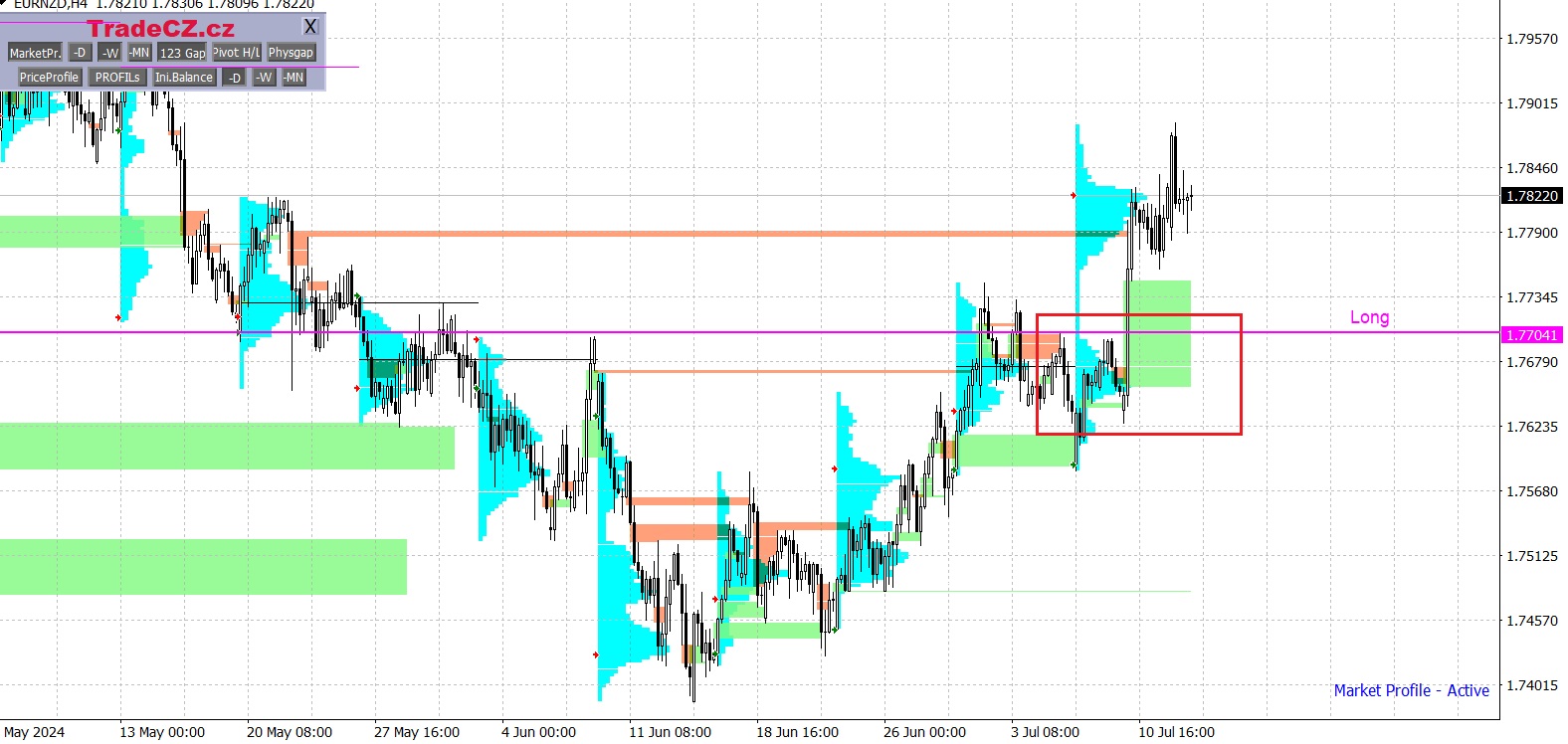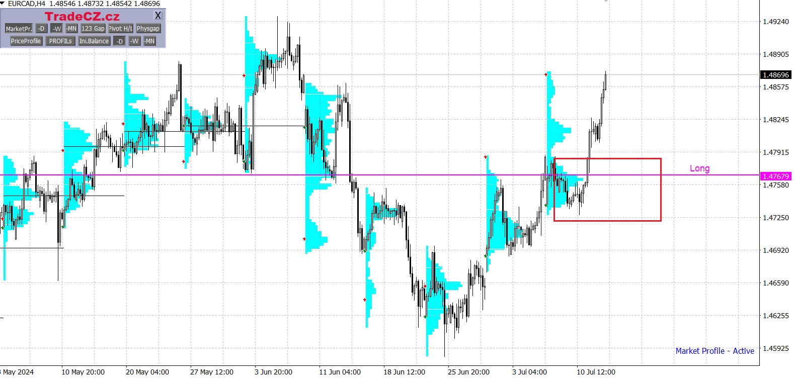 Měnové páry jsou analyzovány pomocí metody Market Profile, která umožňuje v trhu vyhledávat cenové oblasti s největším zájmem obchodníků.