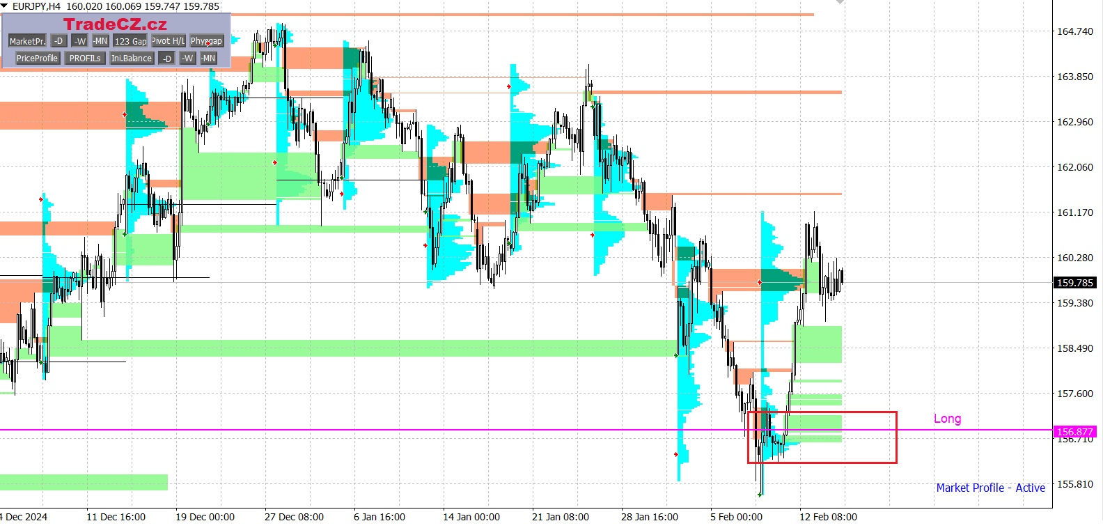 Měnové páry jsou analyzovány pomocí metody Market Profile, která umožňuje v trhu vyhledávat cenové oblasti s největším zájmem obchodníků.