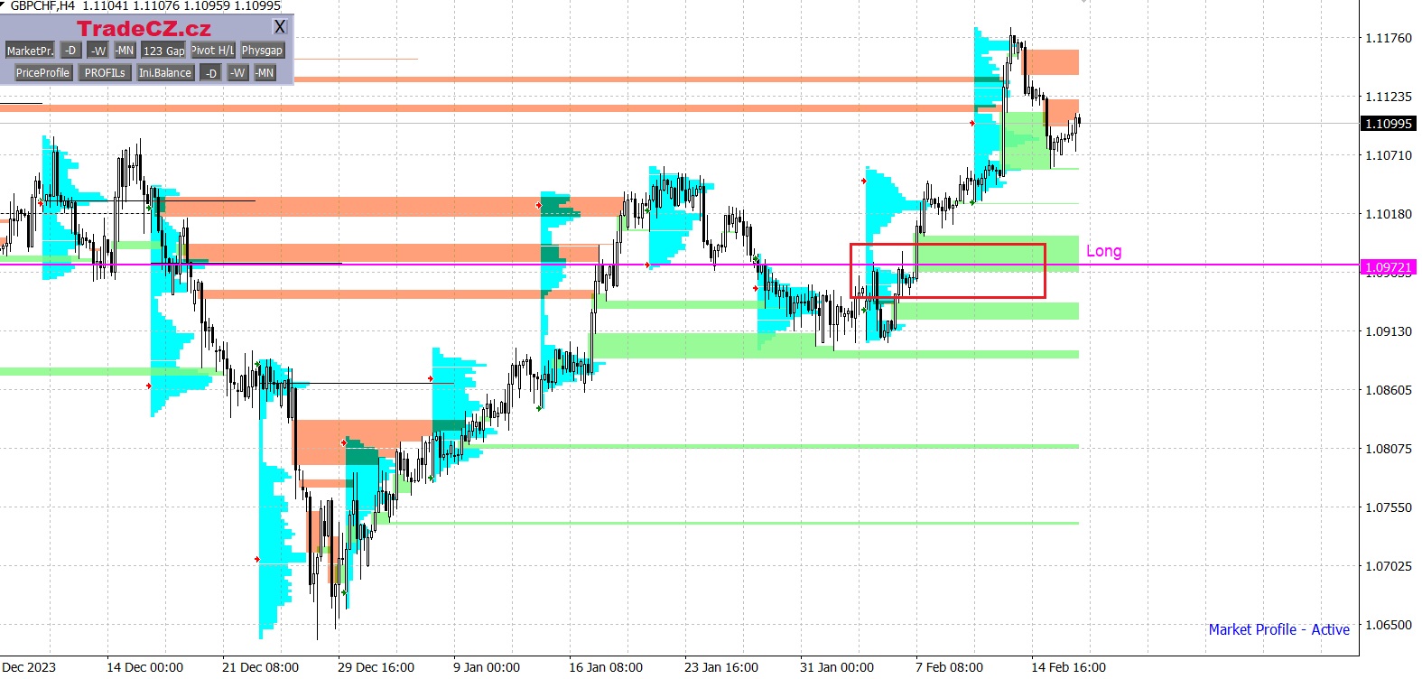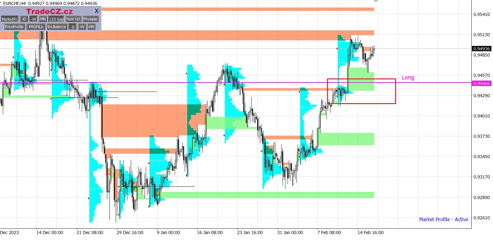 Měnové páry jsou analyzovány pomocí metody Market Profile, která umožňuje v trhu vyhledávat cenové oblasti s největším zájmem obchodníků.