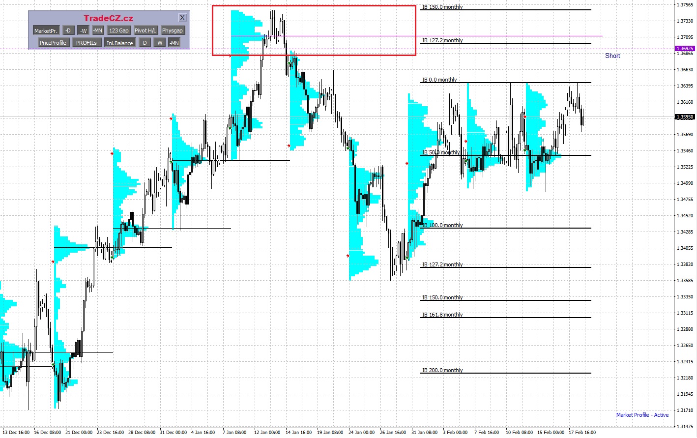 První short obchodní příležitost se nachází na měnovém páru GBP/USD okolo cenové úrovně 1.36925. V této rezistentní oblasti se nachází konfluence jak silného Volume, tak měsíčního Initial Balance 127,2 %. Tato obchodní příležitost vybízí k realizaci rychlého short obchodu, ideálně se vstupem na ceně odpovídající měsíčnímu IB. Růst ceny dále do objemové oblasti není příliš žádoucí, protože by se Low Volume a IB mohly proměnit na support a zabránit tak ziskovému pohybu.