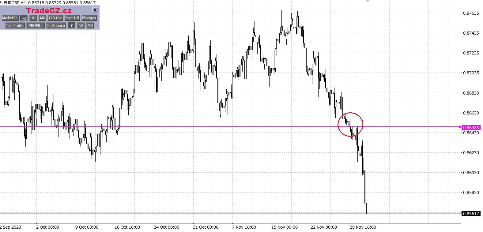 Na druhou stranu byl však trh poměrně vstřícný, a obchodníkům, kteří se z nějakého důvodu rozhodli vstoupit do obchodu, nabídl i možnost výstupu. Tato možnost ukončit obchod s nulovou ztrátou se naskytla po průrazu trhu na nižší úrovně a následném pullbacku na hodnotu vstupu. Ti obchodníci, kteří tuto možnost nevyužili, nejspíše skončili v tomto obchodě ve ztrátě.