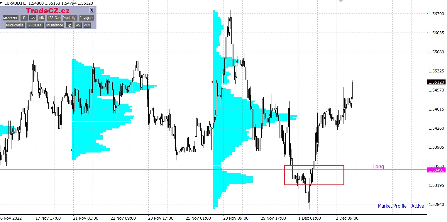 V cenovém výběžku z vyššího časového rámce (H4) vznikl zajímavý support, který je tvořen silnou volume oblastí. Při obchodování cenových výběžků je potřeba počítat s ještě jednou variantou a to je test cenové úrovně pod low výběžku, tzv. výběr likvidity, po jehož vykonání vstupují kupci do trhu. Proto je ideální rozdělit v tomto případě riziko do více exekucí s cílem eliminovat brzký zásah SL.