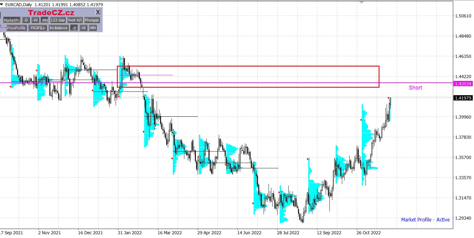 Výrazné posílení evropské měny vůči kanadskému dolaru si vyžaduje přepnout časový rámec a vyhledávat obchodní příležitosti na vyšších timeframech. Na denním grafu existuje výrazná rezistence v podobě konsolidačního pohybu s akumulovaným volume. Trh se v současné době nachází ještě v poměrně velké vzdálenosti, každopádně je velmi pravděpodobné, že bude-li tento směr současného pohybu pokračovat, tak k testu této rezistence brzy dojde.