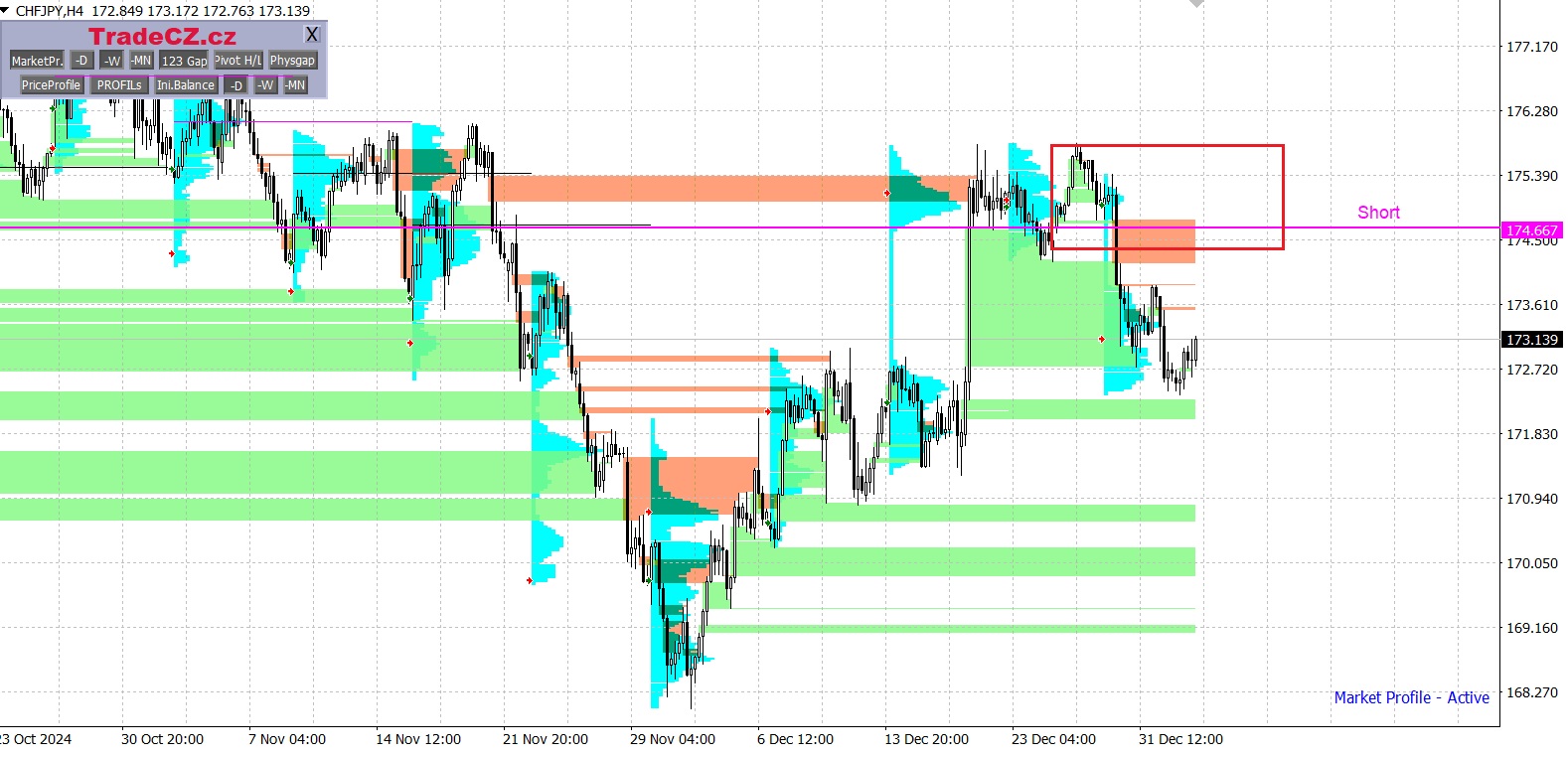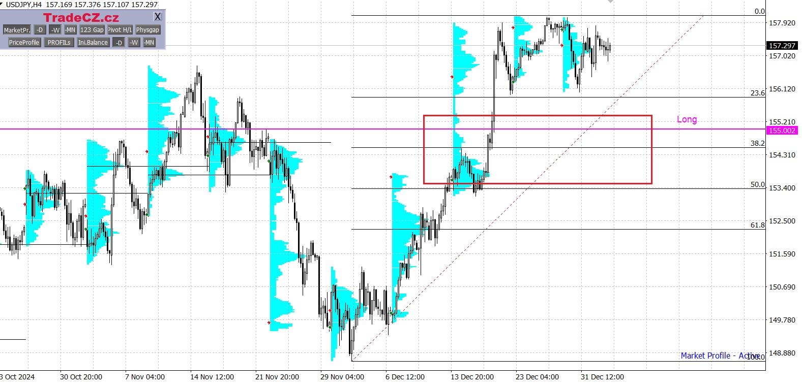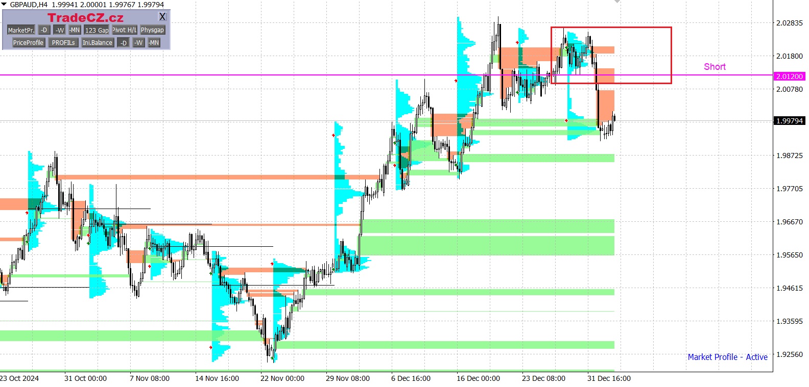 Měnové páry jsou analyzovány pomocí metody Market Profile, která umožňuje v trhu vyhledávat cenové oblasti s největším zájmem obchodníků.