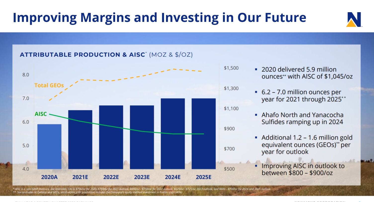 V případě NEM se náklady pohybují kolem 1 045 USD / unci (AISC). Společnost se chce v příštích několika letech dostat pod 900 USD / unci, což se aktuálně projevuje v nákladech společnosti, viz výkazy.