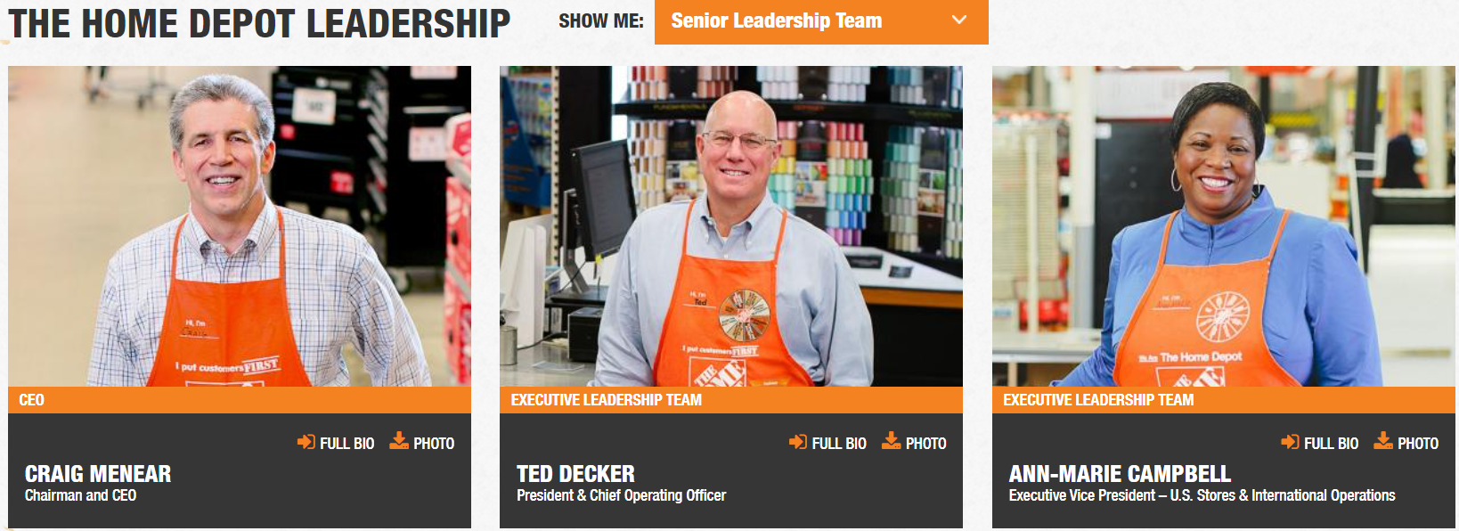 Předsedou a generálním ředitelem (CEO) společnosti The Home Depot je Craig Menear. Craig byl jmenován generálním ředitelem a prezidentem v listopadu 2014 a předsedou v únoru 2015. Za více než 20 let ve společnosti zastával role zahrnující merchandising, dodavatelský řetězec, provoz obchodů, sourcing, marketing a online (CEO).