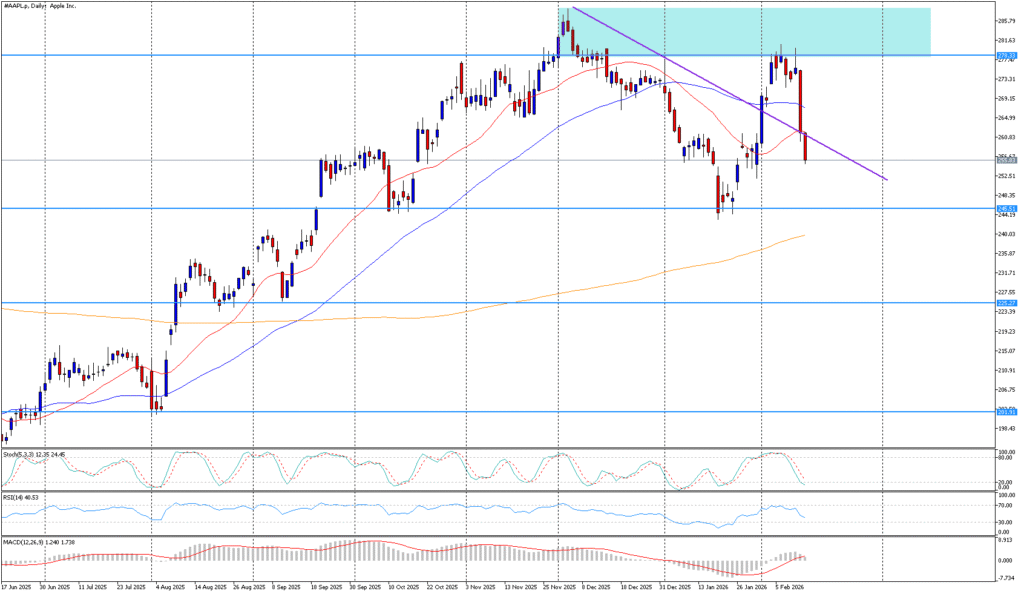 Akcie společnosti Apple Inc. ve čtvrtek prudce oslabily a propadly se až na 259,26 USD, když se spolu s ostatními technologickými giganty dostaly pod výrazný prodejní tlak.