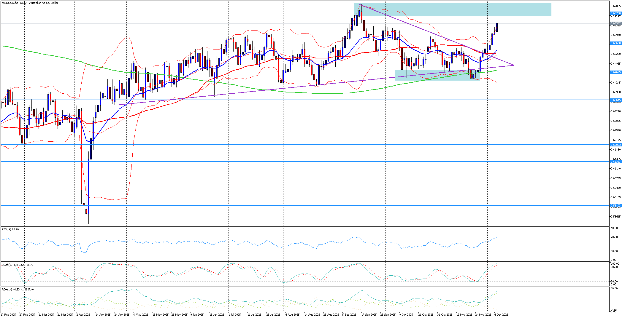 Tento vývoj podpořila kombinace silných makroekonomických údajů – růst HDP Austrálie ve třetím čtvrtletí a nejrychlejší tempo spotřebitelských výdajů za poslední dva roky doprovázené inflací, která se opět vzdaluje cíli RBA. To vyvolalo spekulace, že by centrální banka mohla na příštím zasedání znovu otevřít otázku zvýšení úrokových sazeb. K prudkému růstu přispělo také technické hledisko, když pár uzavřel nad hladinou 0,6547 a téměř kompletně smazal pokles z období září–listopad. Nyní se však cena blíží významné rezistenci na 0,6650, kde se nachází linie dlouhodobého klesajícího trendu vycházející ze září 2024. Technické indikátory, včetně RSI a stochastického oscilátoru, již vstupují do oblasti překoupenosti, což naznačuje možné zpomalení momenta. Pokud by však býci získali další podporu a překonali 0,6650, trh by se mohl rychle posunout k maximu ze září 2025 na 0,6700. Nad touto úrovní by se potenciální rezistence přesunula na 0,6760 a následně na důležitou linii odporu, která spojuje klíčová maxima z května a září 2025 poblíž 0,6830. Na opačné straně by návrat pod 0,6600 mohl vyvolat korekci směrem k oblasti kolem 20denního a 50denního SMA na 0,6535. Další oslabení by pak přesměrovalo pozornost k 200dennímu SMA poblíž 0,6475 a následně k podpoře na 0,6410. Celkově rychlý nárůst AUD/USD naznačuje sílu býků, avšak blízkost překoupených úrovní a rezistence na 0,6650 vyžaduje zvýšenou opatrnost.