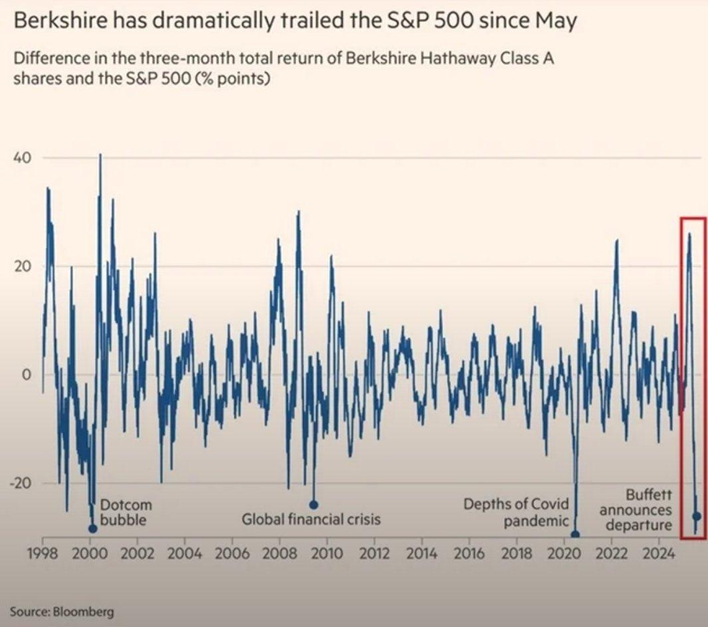Jenže euforie netrvala dlouho. Trhy se rychle uklidnily a začaly růst. Berkshire, která mezitím získala prémium, o něj přišla. Do toho přišla zpráva, že Warren Buffett na konci roku odejde z pozice CEO.