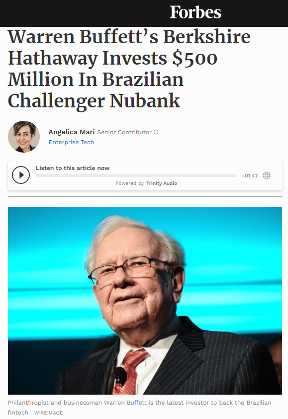 Za zmínku k tomuto tématu stojí také nedávná investice Berkshire Hathaway, tedy Warrena Buffetta, ve výši 500 milionů dolarů do brazilské digitální banky Nubank.