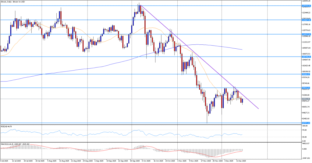 Cena se stabilizovala u 20denního jednoduchého klouzavého průměru, jenž se stal krátkodobým bodem rovnováhy po zvýšené volatilitě vyvolané posledním snížením sazeb Federálního rezervního systému. Právě toto rozhodnutí Fedu krátkodobě srazilo bitcoin pod úroveň 90 000, avšak následně se trhu podařilo ztráty korigovat. Současné cenové chování naznačuje, že obchodníci se nyní soustředí spíše na udržení trendové struktury v rámci rozpětí než na agresivní nákupní aktivitu. Bitcoin se pohybuje těsně pod krátkodobou klesající trendovou linií vedenou od říjnového historického maxima, což zatím omezuje růstový potenciál. Průlom nad tuto linii, která se nachází kolem 93 400 USD a zároveň tvoří horní hranici téměř měsíčního pásma, by však mohl výrazně zlepšit technický výhled. V takovém scénáři by se pozornost přesunula k 50dennímu SMA poblíž 97 500 USD, následovanému silnými rezistencemi v oblasti 98 000 a psychologické hranice 100 000 USD. Na straně poklesu zůstávají klíčové podpory na 89 000 USD, dále na 85 200 USD a na spodní hranici širšího rozpětí kolem 80 000 USD. RSI se v denním grafu drží poblíž neutrální úrovně 50, zatímco MACD setrvává v záporném teritoriu, i když nad svou signální linií. To naznačuje slábnoucí, avšak stále přítomný prodejní tlak. Bitcoin se sice stabilizoval po zasedání Fedu, avšak k jasnému obratu bude zapotřebí přesvědčivý průlom nad klesající trendovou linii.