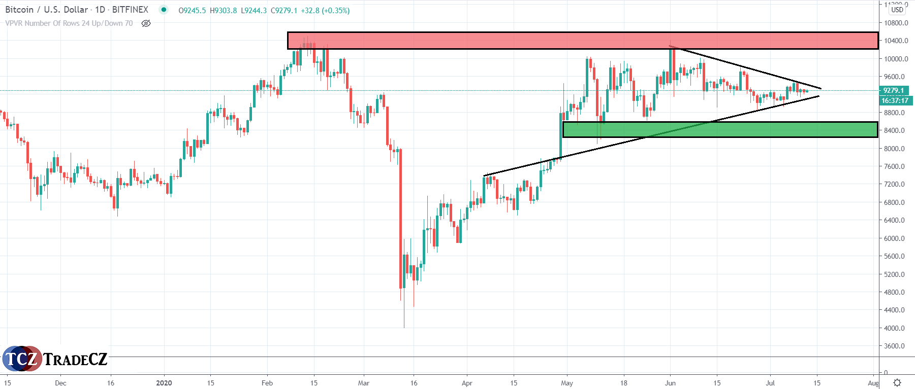 Nyní se Bitcoin pohybuje v úzkém cenovém rozpětí mezi 9 000 – 10 000 USD. Trh vytváří formaci trojúhelník, ale v případě jejího překonání bych byl opatrný s myšlenkou dlouhodobého trendu a výrazného pohybu trhu. Pro ten bude zapotřebí zlepšení globální nálady investorů, aby začali nakupovat také riziková aktiva a spekulativní pozice na kryptoměnách.