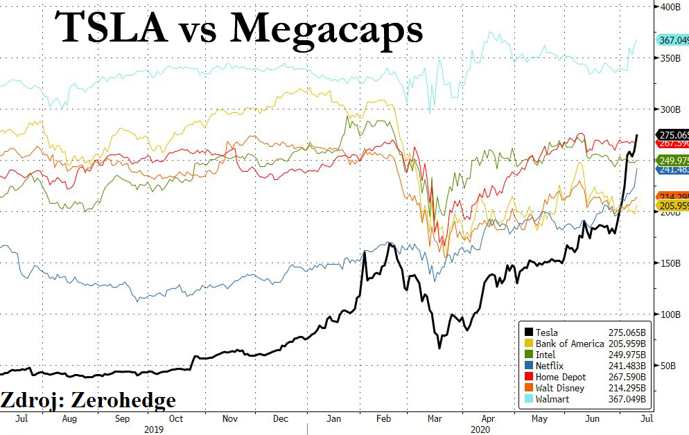 Tesla je aktuálně hodnotnější než Netflix, Walt Disney, Intel nebo Bank of America. Při nynější horečce po akciích Tesly nebude trvat dlouho a Tesla může přerůst i giganta jako je Walmart.