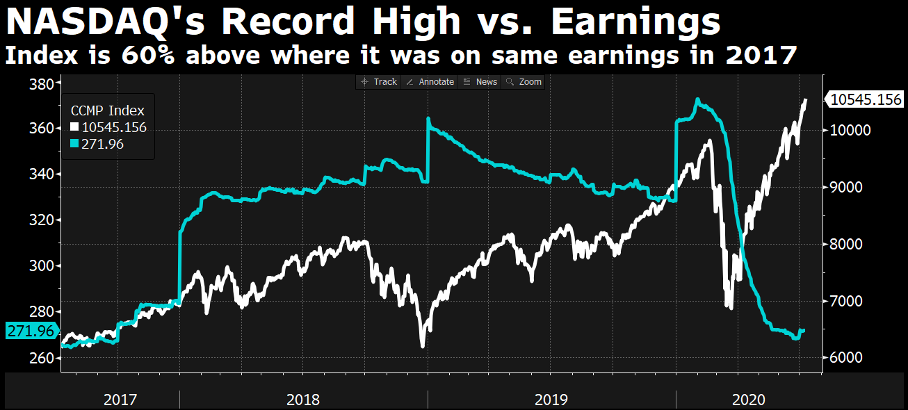 Rozevírající se nůžky mezi hodnotou NASDAQ a výdělky společností.