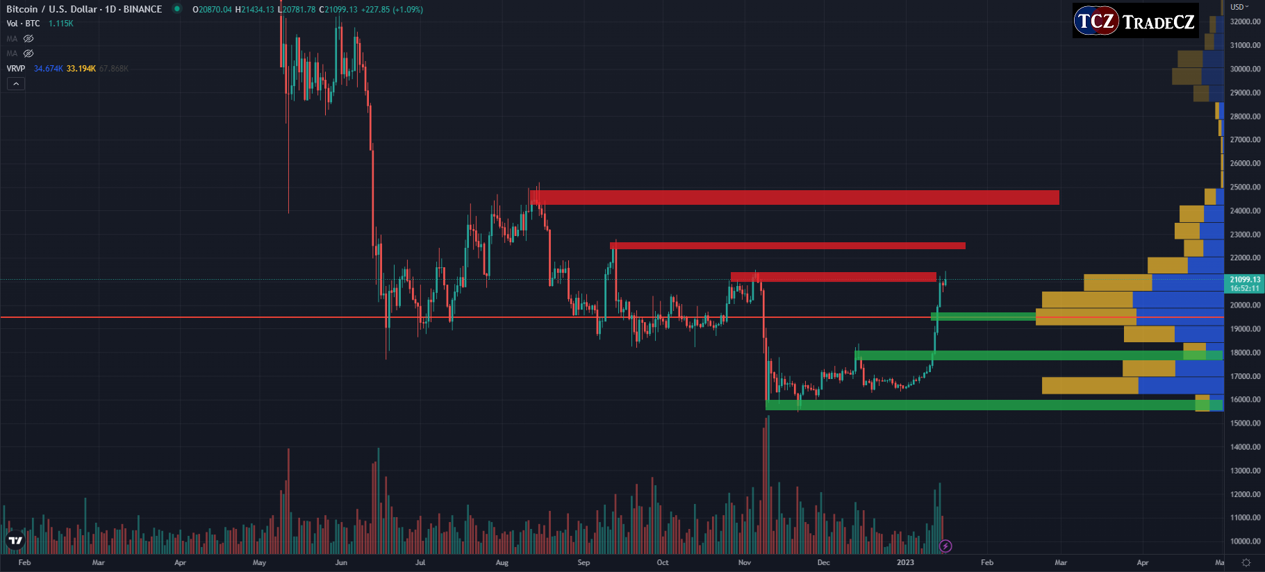 Bitcoin je zpátky ve hře! Bitcoinu se podařilo vymanit z déletrvající konsolidace mezi 16-17 500 USD a při poměrně vysokém objemu se dostal až do horní oblasti hodnoty, překonal POC kolem 19 500 USD a usadil se v chopu mezi 18 500-24 000 USD. V tento moment už se nejedná o pouhý pullback zpátky, ale o návrat na vyšší cenové úrovně.
