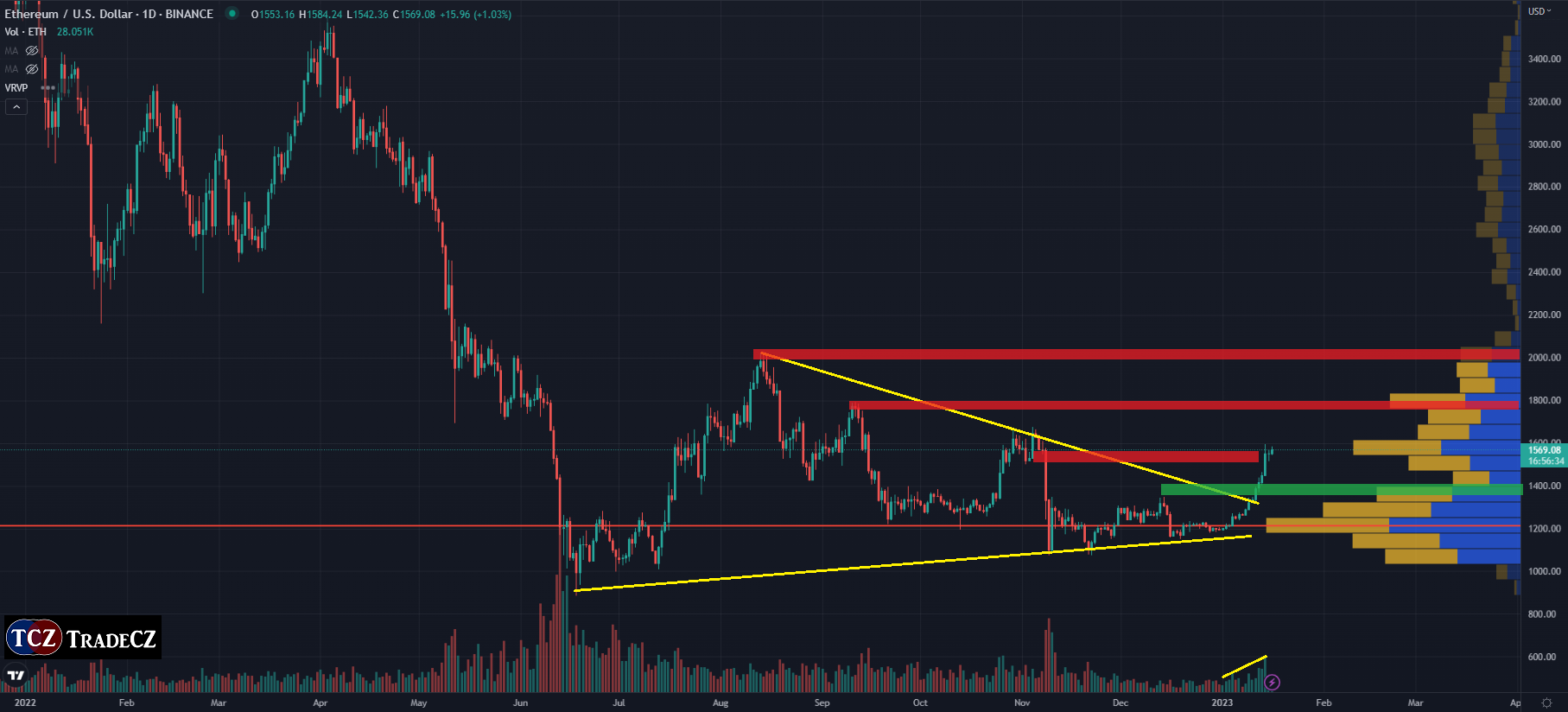 Největší altcoin Ethereum se po breaku lokální konsolidace dostal ža k resistanci 1 600 USD, kde se nachází poslední výrazný vstup velkých hráčů (shortařů) a kde trh zalepil skrytý gap.